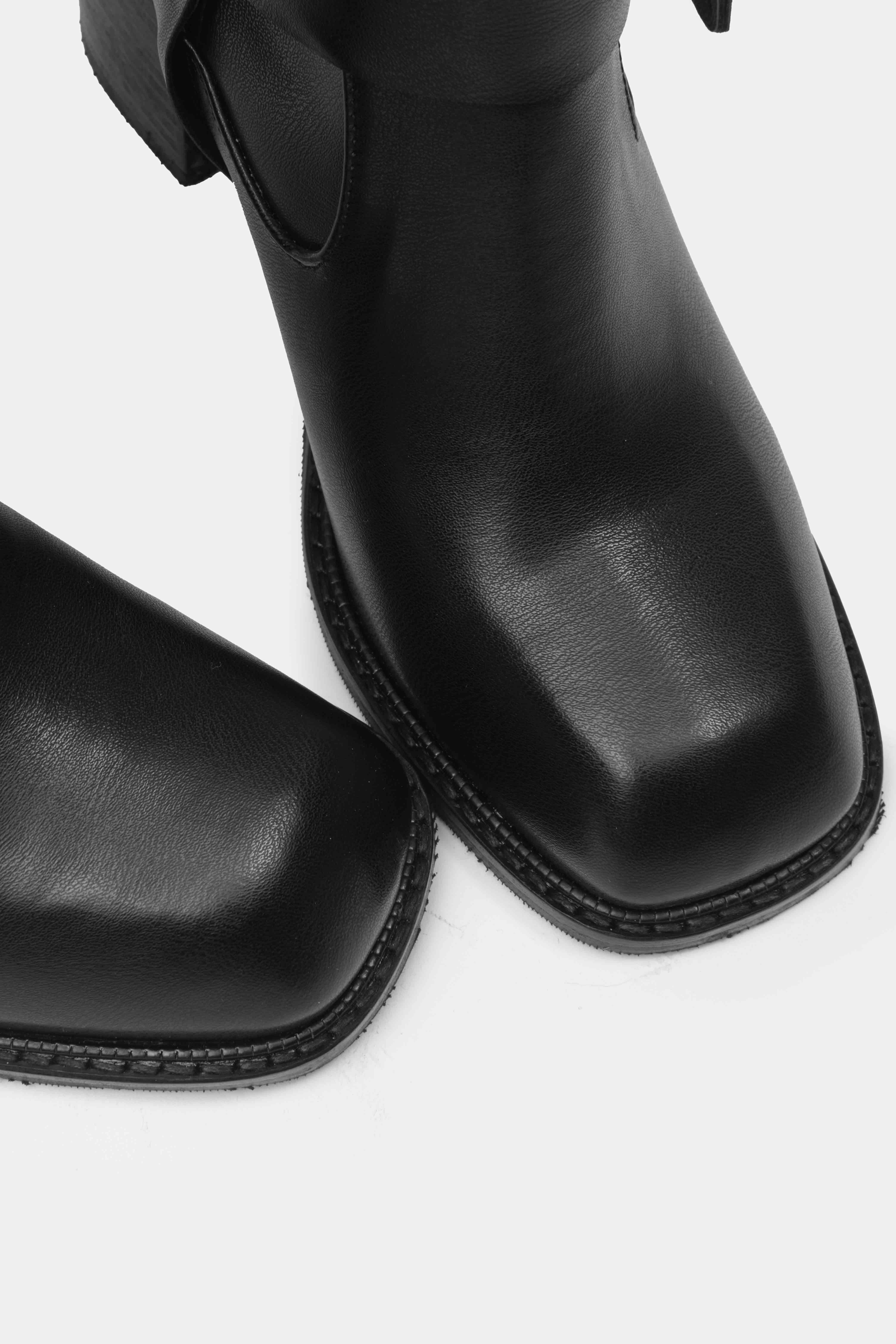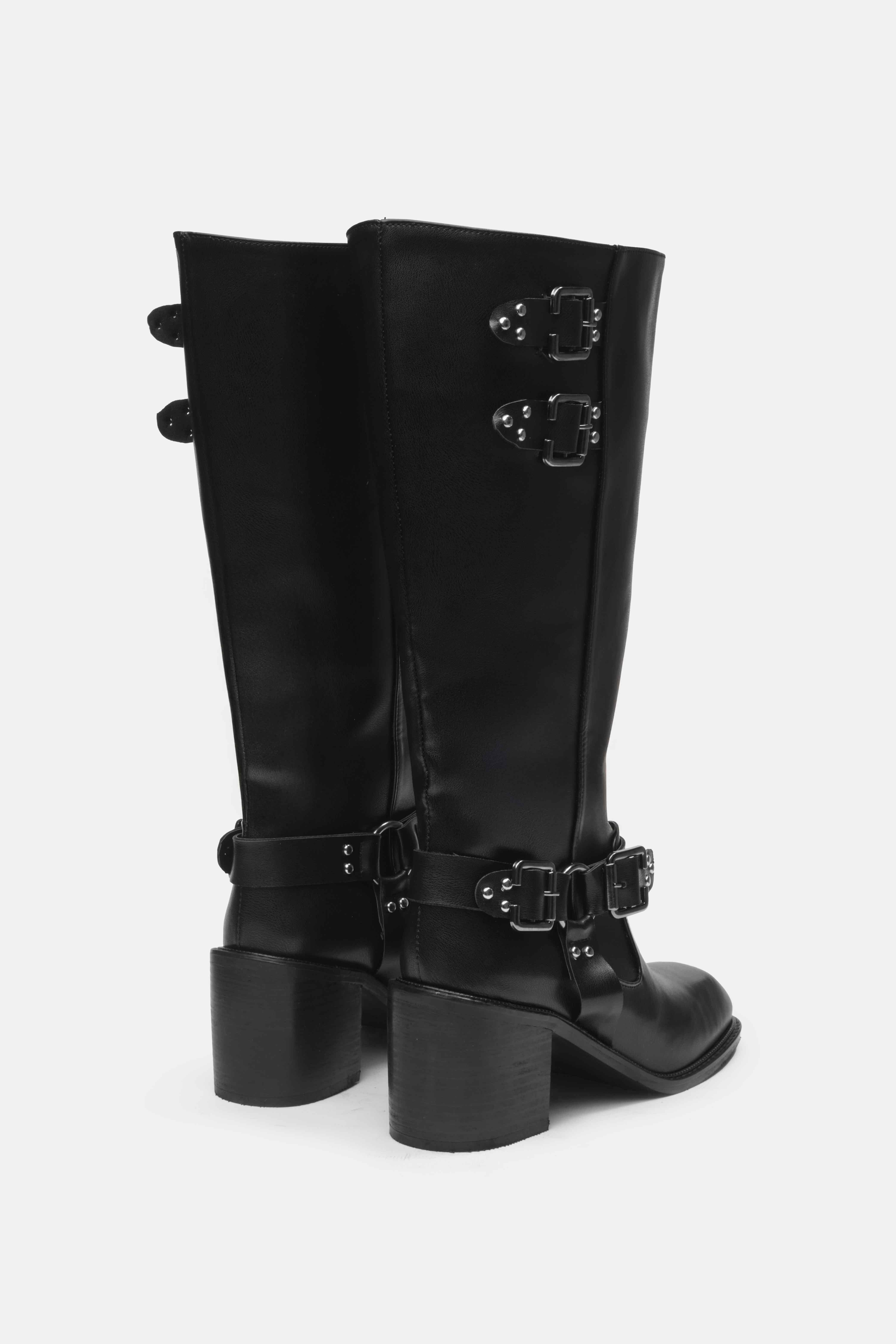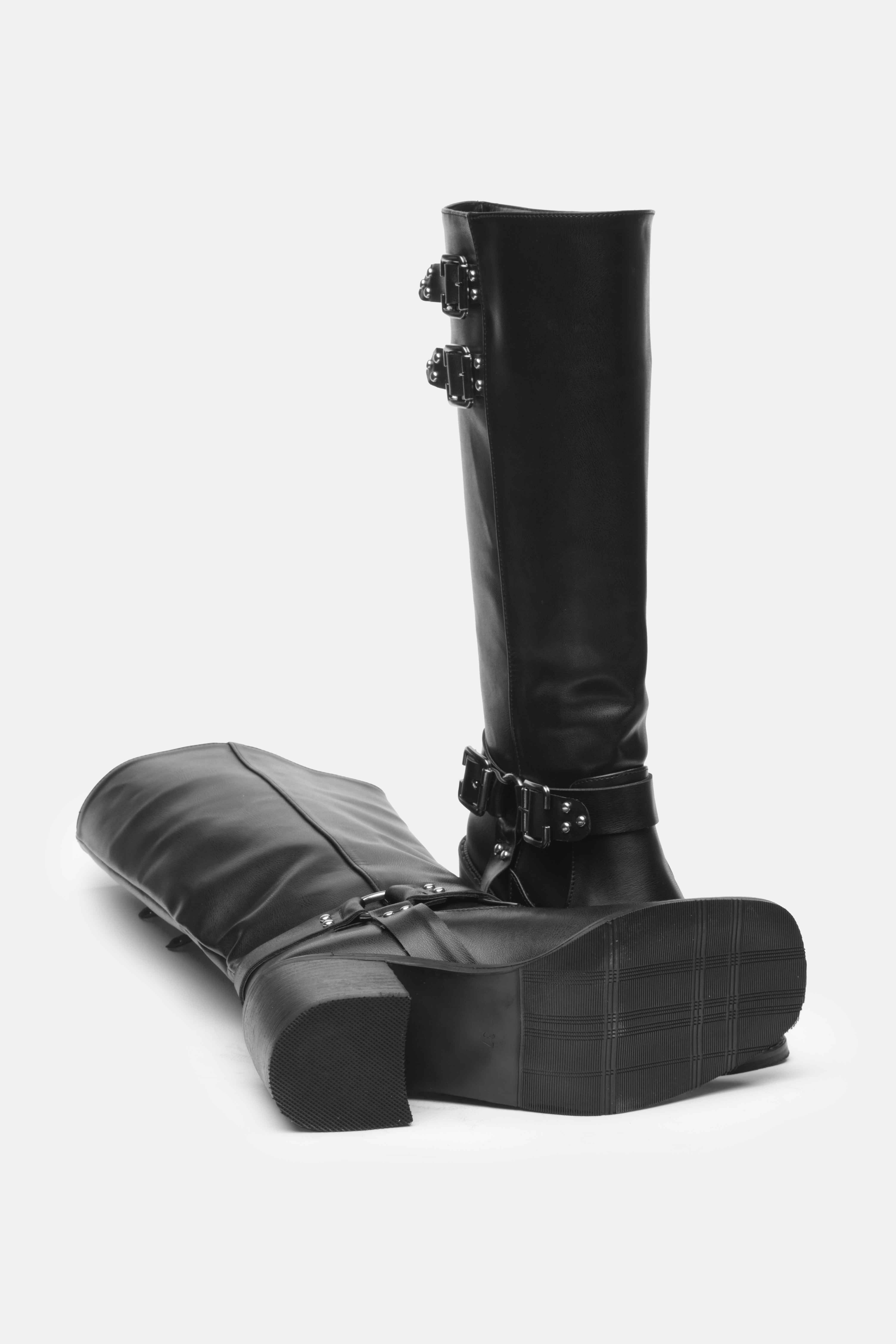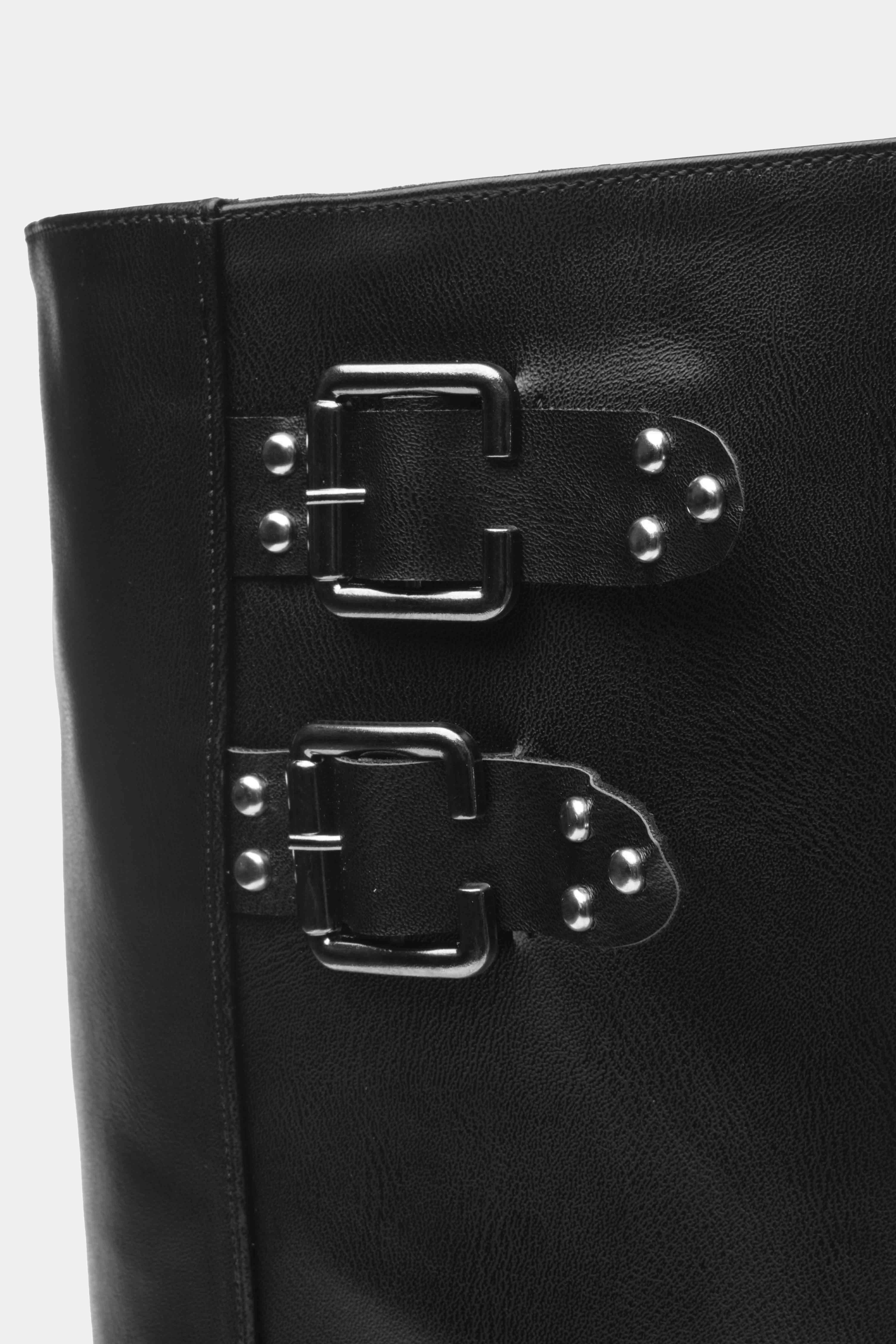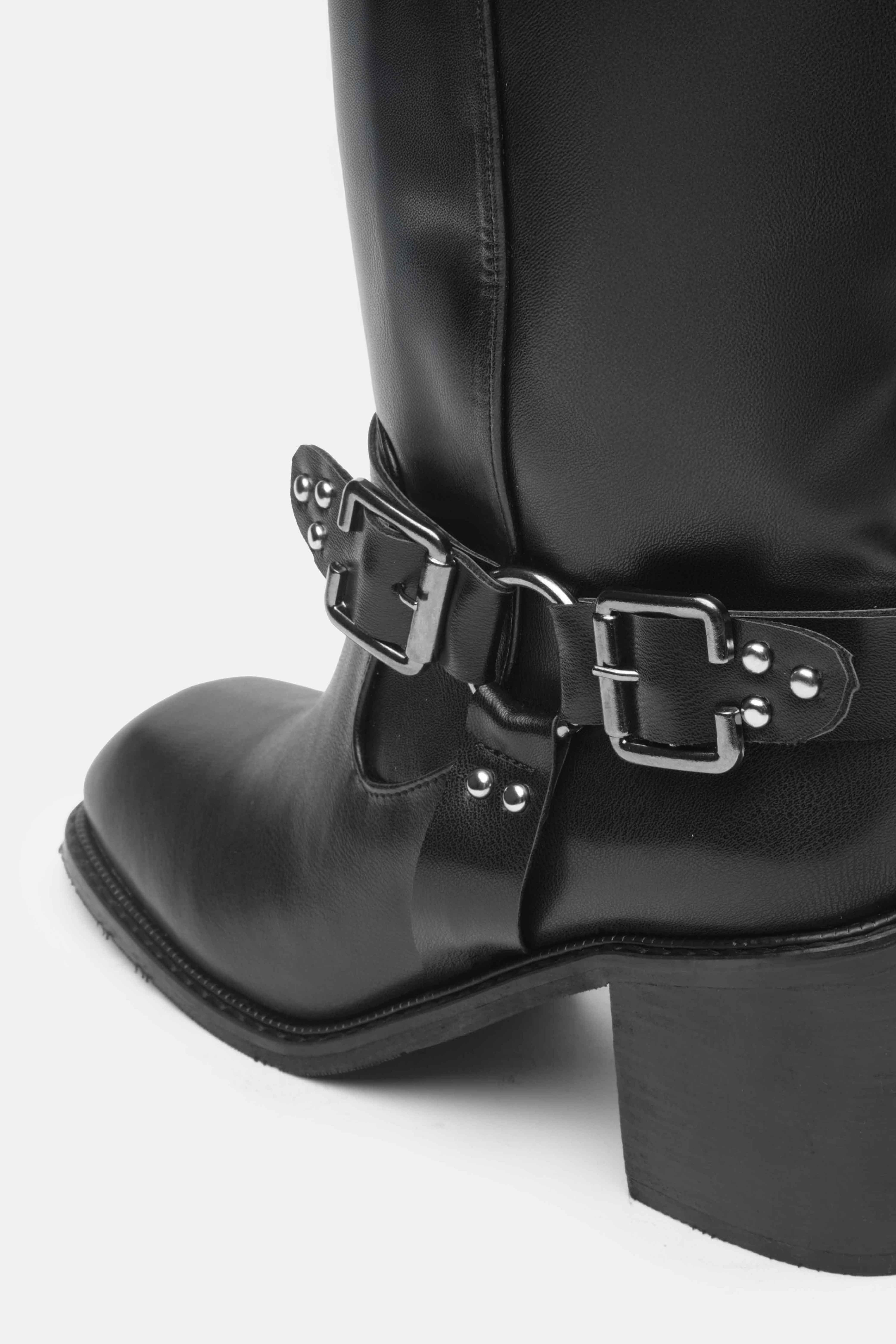 Şıklığı ve rahatlığı bir arada sunan siyah uzun topuklu kadın çizme, iddialı tasarımıyla stilinize güçlü bir dokunuş katar. Üst kısmındaki çift tokalı kayış detayı ve bilekte yer alan metal halkalı kemer süslemeleri, çizmenin modern ve rock tarzını ön plana çıkarır.